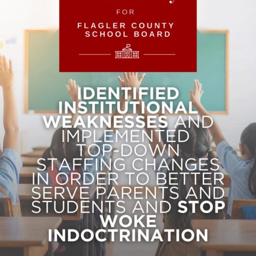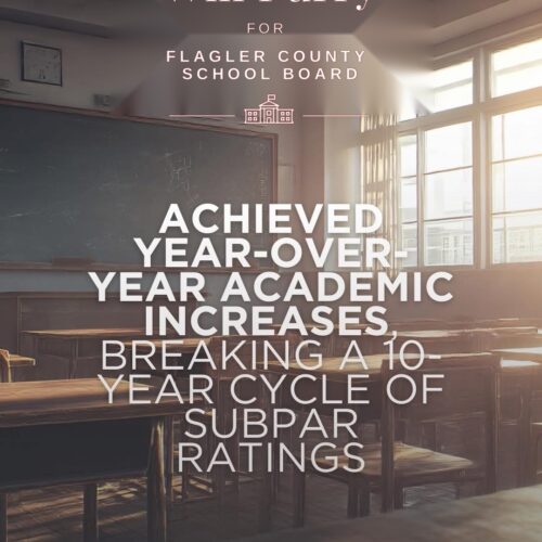 “In 2022 you elected me to bring transformative leadership to Flagler Schools. I am proud to say that I delivered on all my promises. We have been winning on all fronts and I am asking you to re-elect me so we can keep winning for the students, parents and teachers of Flagler Schools”
