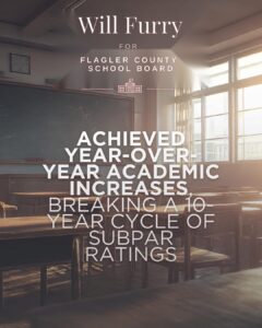 Will’s focus has always been delivering real wins for Flagler Schools. Under his leadership and oversight, the district worked to cut wasteful spending, streamline operations, rebuild reserve funds to $11 million, improve staffing and organizational performance, and drive year-over-year academic gains. Will has also stood firmly for parents’ rights and pushed back against radical ideologies that distract from education.