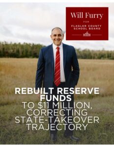 William “Will” Furry is a Christian, conservative husband and father who believes that strong schools start with strong families, strong values, and leaders who are accountable to the people. Will is running for re-election to the Flagler County School Board to continue fighting for parents, students, and taxpayers across Flagler County.